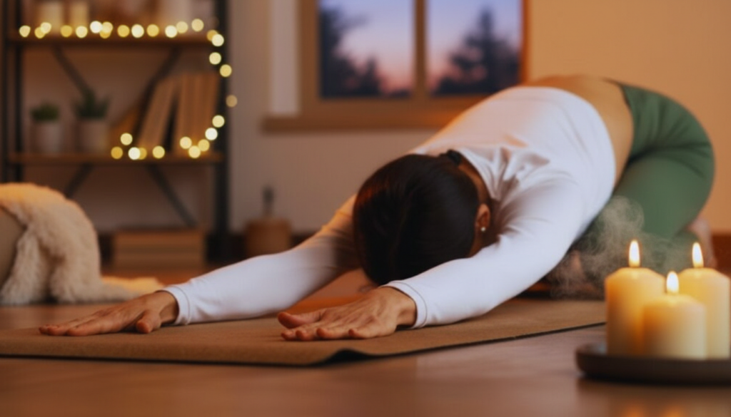 Child’s Pose is a gentle way to relax that stretches your back, hips, and thighs. It calms your nervous system and makes it easier for you to breathe. This pose is good for lowering stress and helping your body relax.