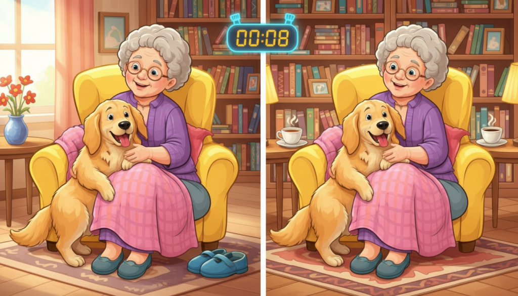 test their attention to detail have always loved “Spot the Difference” puzzles. These challenges are fun and good for your brain, so they’re a great way to sharpen your mind. The goal of this puzzle is to find three things that are different between two pictures of a grandma and her dog that are almost the same. What’s the twist? You have only 8 seconds to find all the changes. This quick task tests your ability to see, focus, and think quickly under pressure.